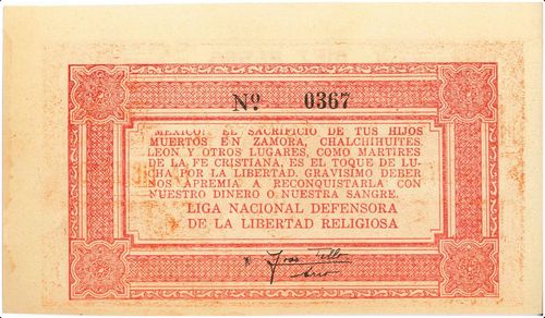 In 1927 the LNDLR issued bonds, in the values of 20c, 50c, $1, $5 and $10 to raise funds. The text on the reverse appeals to the martyrs who had given their lives in Zamora, Chalchihuites, León and other places.