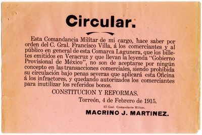 Esta Comandancia Militar de mi cargo, hace saber por orden del C. Gral. Francisco Villa, á los comerciantes y al público en general de esta Comarca Lagunera, que los billetes emitidos en Veracruz y que llevan la leyenda “Gobierno Provisional de México”, no son de aceptarse por ningún concepto en las transacciones comerciales, siendo prohibida su circulación bajo penas severas que aplicará esta Oficina á los infractores, y quedando autorizados los comerciantes para inutilizar los referidos bonos.