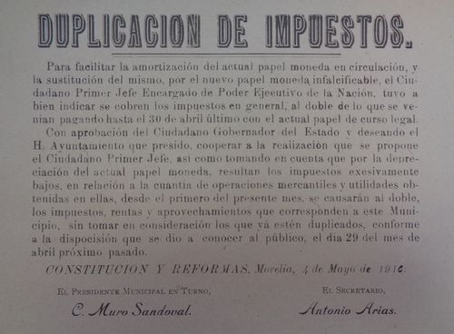 C. Muro Sandoval, Presidente Municipal, doubles taxes, Morelia, 4 May 1916