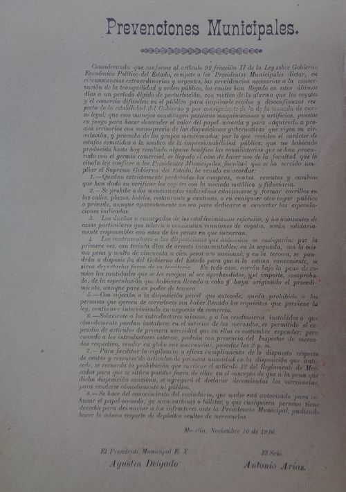Considerando: que conforme al artículo 92 fracción II de la Ley sobre Gobierno Económico Político del Estado, compete a los Presidentes Municipales dictar, en circunstancias extraordinarias y urgentes, las providencias necesarias a la conservación de la tranquilidad y orden público, los cuales han llegado en estos últimos días a un período álgido de perturbación, con motivo de la alarma que los coyotes y el comercio difunden en el público para inspirarle recelos y desconfianzas respecto de la estabilidad del Gobierno y por consiguiente de la de la moneda de curso legal; que esos manejos constituyen positivas maquinaciones y artificios, puestos en juego para hacer descender el valor del papel moneda y para adquirirlo a precios irrisorios con menosprecio de las disposiciones gubernativas que rigen su circulación, y provecho de los grupos mencionados; por lo que revisten el carácter de estafas cometidas a la sombra de la impresionabilidad pública; que no habiendo producido hasta hoy resultado alguno benéfico las consiliatorias que se han procurado con el gremio comercial, es llegado el caso de hacer uso de la facultad que la citada ley confiere a los Presidentes Municipales, facultad que se ha servido ampliar el Supremo Gobierno del Estado, he venido en acordar: