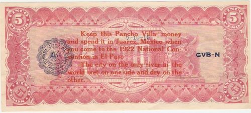 'KEEP THIS PANCHO VILLA MONEY AND SPEND IT IN JUAREZ, MEXICO WHEN YOU COME TO THE 1922 NATIONAL CONVENTION IN EL PASO. THE CITY ONLY RIVER IN THE WORLD WET ON ONE SIDE AND DRY OTHER.' with printer's imprint 'THE HOUSE OF McMATH EL PASO.', known on $1 and $5 dos caritas.