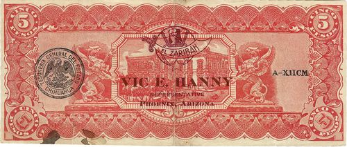 'EL ZARIBAH (in Masonic device)/VIC E. HANNY/REPRESENTATIVE/ PHOENIX, ARIZONA', known on $5 dos caritas
