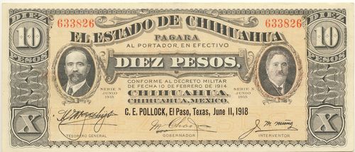 'C. E. POLLOCK, El Paso, Texas, June 11, 1918', known on $10 and $20 dos caritas