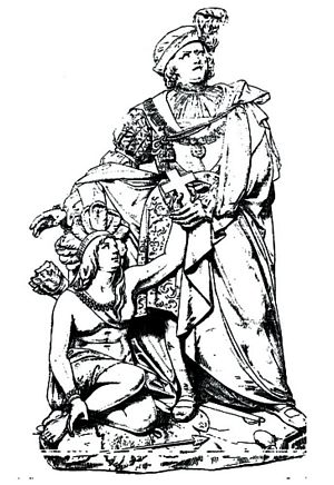 The Columbus-America vignette builds on a long artistic history of pairing such figures. For example, Galle’s engraving of c1600 features a Columbus-like Amerigo Vespucci standing before America seated on a hammock, Persico’s 1844 statue, formerly at the east portico of the U.S. Capitol, has a triumphant Columbus looming over a cowering America stripped nearly naked, whilst Vela’s bronze in Colón, Panamá, which debuted at the 1867 Paris Exposition, presents a towering Columbus comforting a traumatized America.