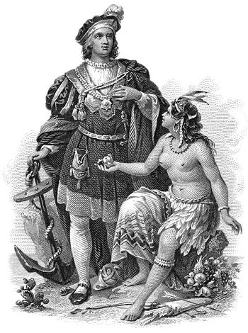 With the Native American woman signifying America, what would Columbus represent? In keeping with her example as a continental allegory, he undoubtedly personifies Europe in general. Sailing under the Spanish flag as a native of Genoa, Italy, he also stands for Spain in particular and perhaps even Italy.