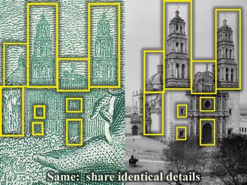 The Columbus-America vignette was used on banknotes of nine countries in mainland Spain and throughout the Americas, including Mexico. In all cases the vignette is either primary or secondary, always on the front, and when secondary, it is usually accentuated by being larger and/or in a frame.
