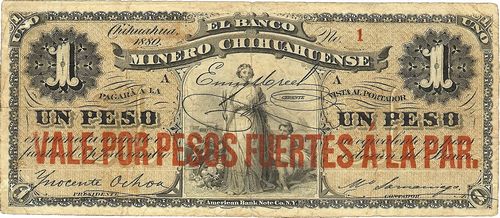 As stated, on July 1883 the bank’s concession was altered so that 150,000 of the 300,000 pesos already authorised could be issued in notes payable in silver pesos (á la par por pesos fuertes). According to a note in the ABNC records 118,146 notes were overprinted with “VALE PESOS FUERTES A LA PAR” in August 1883 so it was then that the bank moved from basing (some of) its notes on copper to silver. At the beginning of 1885 the experienced Santiago Wastall was put in charge of a new competitor in Chihuahua, a branch of the Banco Nacional de México, where, it was reported, he had to contend with the problem that most of that state’s existing banknotes were based on copper, rather than silverEl Album de la Mujer, Año 3o, Tomo 4o, Núm. 6, 8 February 1885.
