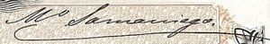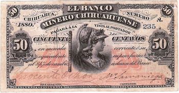 The signatories on the Banco Minero Chihuahuense notes are Inocente (Ynocente) Ochoa as President, Mariano Samaniego as Accountant (Contador), and Enrique Creel as Manager (Gerente). The 1880 printing were delivered without signatures, whilst the rest had the signatures engraved on the notes.