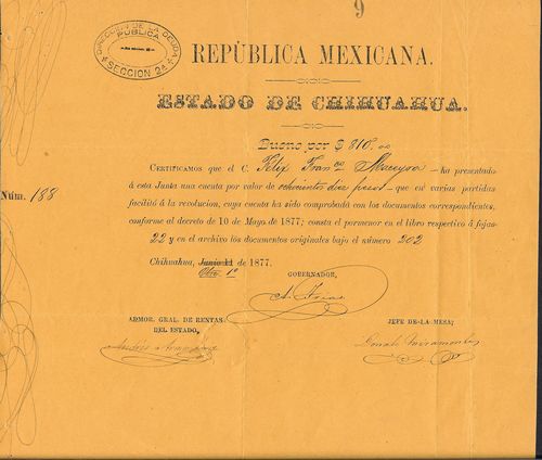 Such certificados carried the printed date 11 June 1877 (frequently amended by hand) and were signed by the Governor (Pedro Hinojosa or Angel Trias), Administrador General de Rentas (M. G. Vidal or Andrés Armendáriz) and Jefe de la Mesa (Vicente Ochoa or Donato Miramontes)The text of such certificados was 'Republica Mexicana/Estado de Chihuahua/Bueno por .../Certificamos que el C .... ha presentado á esta junta una cuenta por valor de ... en varias partidas facilitó á la revolución, cuya cuenta ha sido comprabada con los documentos correspondientes, conforme al decreto de 10 de mayo de 1877...' One certificado (Num. 98) was transferred to different parties seven times between July 1877 and January 1895.