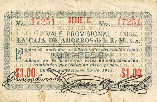 To overcome this problem on 21 October 1913 Mercado agreed with the Chamber of Commerce that the Caja de Ahorros de la República Mexicana should issue up to 25,000 pesos in notes (vales provisionales) for twenty centavos, fifty centavos and one peso. These notes were to be readily accepted and exchangeable for banknotes in multiples of five pesos. They were dated 25 October 1913. The first issue was signed by Martín Falomir as Manager (Gerente) and Juan Woodworth as Cashier (Cajero).