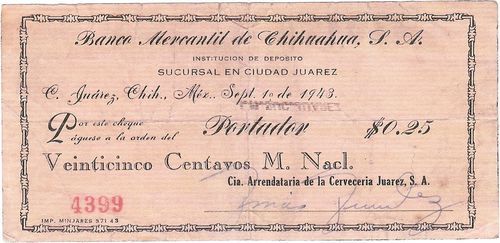 In Chihuahua, the Financiera de Industria y Comercio S.A. de C.V. issued a series of cheques for 25c and 50c, dated 20 August 1943, drawn on the Banco Mercantil de Chihuahua. The 50c notes were put into circulation on 23 August La Voz de Chihuahua, 22 August 1943, El Heraldo, 22 August 1943. The 25c notes must have been issued later, though they bear the same date, and their appearance was not marked by any newspaper report.