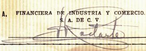The 50c notes were signed by one of the following employees of the Banco Mercantil: Benito Fernández C., Armandino Pruneda, Raúl Sánchez A., Nestor Colomo, José Prieto U. or Gregorio Ríos Velasco.