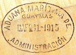A 44mm blue or violet oval rubber stamp with inscription ‘ADUANA MARITIMA DE GUAYMAS - ADMINISTRACION’ and date in centre. Known dates range from 30 March to 2 May 1915Recorded dates are 30 and 31 March, .