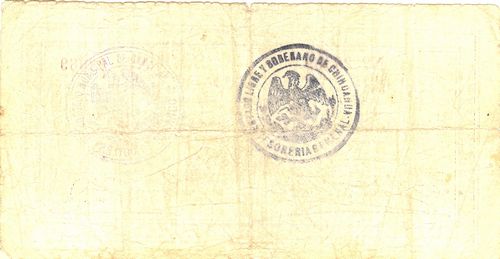 This resello is mentioned but possibly did not exist. On 22 January Teodoro Carillo, the Jefe de Hacienda in Zacatecas, issued a circular that stated, inter alia, that the sábanas should be accepted, as they were only exchanging the ones in poor condition and were revalidating the higher values ($5, $10, $20, $50 and $100)Siglo XX, 22 January 1915. On 26 April 1915 the Director General de Rentas in Zacatecas told the state government that in future the Oficinas Rentísticas would only accept the 25c, 50c and $1 sábanas if they had the resello of the Zacatecas Jefatura de Hacienda, and that offices should send in to the Dirección General any notes that lacked this requirement so that they could be revalidated. This was copied to the various municipios on 29 April AMZ, caja 14, exp 4. folio 184. However, low-value sábanas were not usually revalidated, and Zacatecas was captured by the Carrancistas on 17 July.