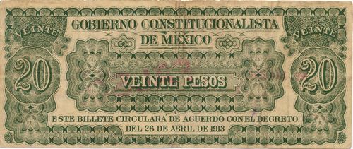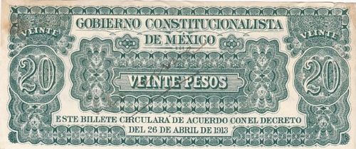 On 12 September 1914 the presidente municipal interino of Magdalena reported that he had confiscated fifteen $20 notes from Quirino Miranda in the belief that they were counterfeit. He marked them ‘no sirve’ on the face and reverseinformation and images from Guzman Sanchez-Schmitz.
