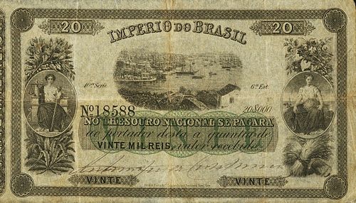 The coat of arms on the 10,000 reis note has two supporters, and so is structurally similar to the Mexican notes. In fact, the Brazilian coat of arms at this time did not have these figures, which have been added by the printers.
