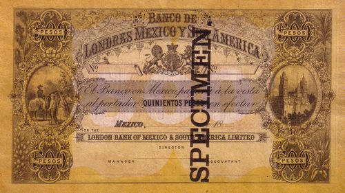 We do not know with absolute certainty who printed these notes. In his overview of the bank’s issuesJosé Herrera Cedillo, Apunte para la historia numismática del papel moneda del Banco de Londres México y Sud-America,(Sociedad Numismática de México, 1981 Herrera Cedillo attributed the printing of the notes to the firm “J. H. Sanders of London,” but this attribution is unlikely as there was no security printer named J. H. Sanders in London at the time. There was a “T. H. Saunders,” but it was not a printer. It was a manufacturer of security paper, although it sometimes arranged the printing of notes by major London currency printers.
