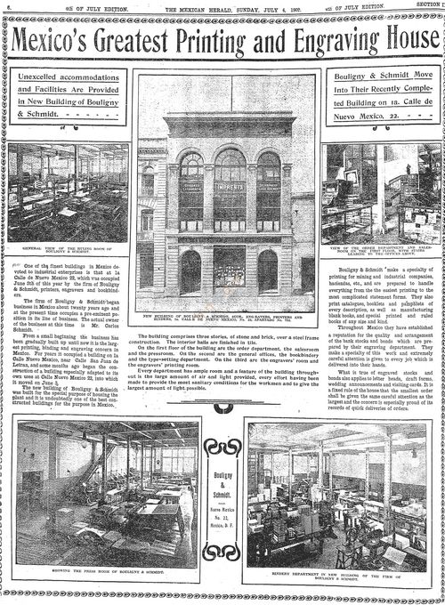 Thereafter, the company was Bouligny & Schmidt, SucesoresIn 1903 its staff included Henry Sitges as manager, Donald and Edwin Murray and Charles Naylor as engravers, and Guillermo Brugmann as bookprinter (The Massey-Gilbert Blue Book of Mexico, 1903).