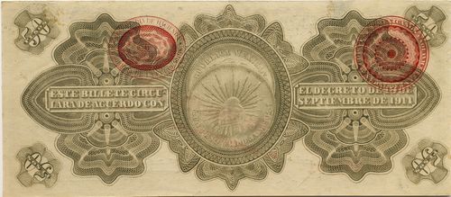 Some notes were revalidated in accordance with the Convention's decree of 17 December 1914 with the legend 'REVALIDADO / por decreto de 17 de diciembre de 1914' on the face and a red round 'E.U. MEXICANOS - TESORERIA GENERAL DE LA FEDERACION' on the reverse.