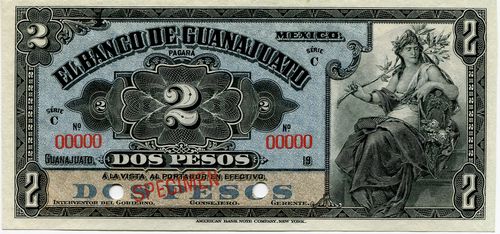 When Huerta removed the restrictions of the Ley General de Instituciones de Crédito the bank decided to issue $1 and $2 notes. Mr. W. H. Porter, the Assistant Treasurer of the Guanajuato Development Company was in New York and requested models. George W. Bryant, a director of the bank and of the Guanajuato Development Company was staying at the Bellevue Stratford Hotel, Philadelphia, Pennsylvania and on 28 November Mr. H. J. Boulvin, of the ABNC, showed him face and back models and gave him a quotation for printing 75,000 $1 and 12,500 $2 notes, which was accepted the next day.