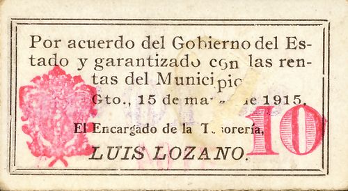 On 5 March 1915, the local authority (Presidencia Municipal) was authorised[text needed] to issue $6,000 in 1c, 5c and 10c fractional notesEl Observador, Guanajuato, 5 March 1915. These had a common template with the denomination, series letter and number on the face, and city coat-of-arms, denomination and signatures on the reverse, applied in a series of passes. Some of these had the stamped names of the Presidente Municipal, Teniente Coronel Manuel R. Rubi and secretario, Agustín Téllez, and others that of Luis Lozano, who was in charge of the municipal treasury.