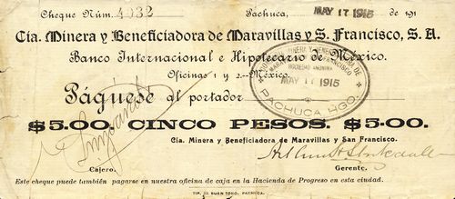 The company also produced cheques al portador, printed by Tipografía El Buen Tono, for $5 and $10 drawn on the Banco Internacional e Hipotecario de México. These were also signed by [ ] as Cajero and Arthur (Arturo) H. Stockdale as Gerente.