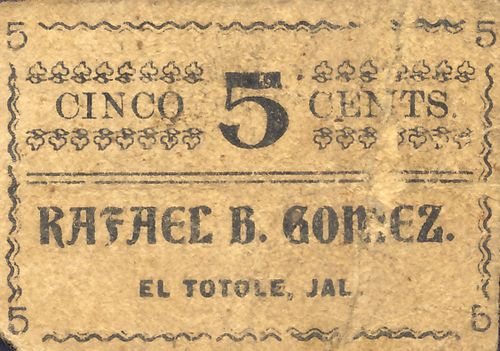Ramón B. Gomez was owner of the Hacienda “El Totole”, in La Huerta, some miles from Autlán. He issued a series of vales for 5c, 10c, 20c and 50c, which circulated widely in the district. They are known in a variety of designs, fonts, text, colours (due to the use of any available paper) and with different validating seals. Some carry a seal of the General Headquarters of the Brigada Moreno (EJERCITO CONVENCIONISTA - BRIGADA "MORENO" - CUARTEL GENERAL) and so these are listed, mistakenly, as a military issue in catalogues including Mexican Paper Money (there are similar private issues, from Antonio R. Olivera in El Grullo, Juan Jiménez in El Limón and José V. Gómez, Teodoro Borbón and Herculano García in Purificación, without such a handstamp).