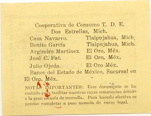 During the silver crisis of 1943, because of the shortage of small change, the cooperative issued vales to pay its wages that could be cashed in the offices of the company or were accepted by its own co-operative store (Cooperativa de Consumo Trabajadores de Dos Estrellas), local stores (Casa Navarro and Benito García in Tlapujahua, Argimiro Martínez, José C. Fat and Julio Ojeda in El Oro) and the branch of the Banco del Estado de México in El Oro.