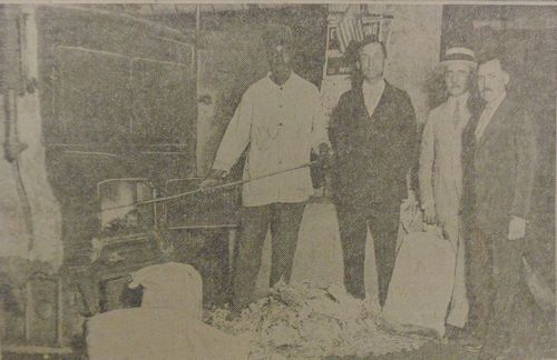 The picture above shows the janitor in the basement of the San Antonio bank shoveling the paper into the furnace, while H. M. Compton, vice-president of the bank, Mr. Manrique (wearing the straw hat) and A. Martinez, San Antonio attorney, look on.