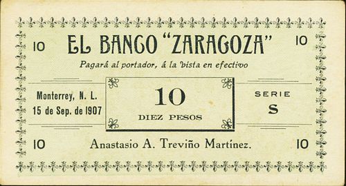 Finally, a series as “EL BANCO ZARAGOZA” dated Monterrey, N. L. 1924.