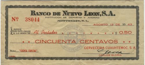 Originally 50c cheques were issued by various factories and casas comercialesEl Porvenir, Año XXV, Núm. 9647, 19 August 1943. Thus, we known of cheques of the Cervecería Cuauhtemoc, S. A., and of its various affiliated companies established to supply necessary ingredients and resources, namely, Malta, S. A., Empaques de Cartón Titan, S. A.,Vidrio Plano, S. A., and Hojalata y Lamina, S. A., drawn on the Banco de Nuevo León, S. A.and dated 12 August (Hojalata y Lamina is also recorded dated 28 August).