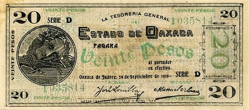 The $20 value was added in Dávila’s second authorisation, decree núm. 5, on 10 July 1915, which provided for 15,000 notes. Then decree núm. 18, on 12 January 1916, authorised a further issue, without specifying the exact amount of $20 notes.