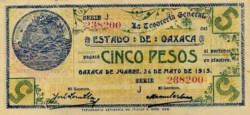 Originally decree núm. 2 on 19 February 1915 authorised 70,000 $5 notes. Then on 10 July decree núm. 5 added a further 150,000 notes. Finally, decree núm. 18, on 12 January 1916, authorised a futher issue, without specifying the exact amount of $5 notes.