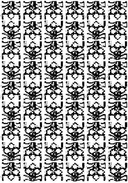 One portion of the background that is relatively easy to study is the field behind the Juarez portrait. This is comprised of 54 ornamental types arranged six across and nine down, each in the form of a stylized flower. The flower ornament may be up or down.