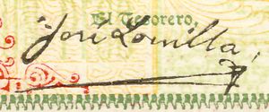 The face of the note was completed with the printing of the signatures of José Zorilla, Treasurer, and Manuel Velasco, Accountant, plus the series letter, all in black, and the serial number in red or, in the case of 5 pesos notes numbered one million or higher, in green. The letters used were J-U-A-R-E-Z, later P-D-I-A-Z, and Y (for the next to last 5 pesos printing in 1915). Juárez and Porfirio Díaz were both native to Oaxaca. The significance of the letter Y is not clear. At first, the letters JUAREZ were employed without repetition for notes sharing the same date. The first printings of the 1 peso, all dated 24 February 1915 bear the letters U, R and Z (each representing a separate printing) while the 5 pesos notes with the same date bear the letters J, A, and E. They probably alternated the production of the two denominations so the letters appeared in the order: J, U, A, R, E, Z. A printing could have consisted of anything from a few thousand notes to well over 100,000. The next printings, dated 20 April 1915, utilize the same letters in a different order - 1 peso: J, A, and E, and the 5 pesos: R, U, and Z. The six printings dated 26 May 1915 (also consisting of three for each denomination) used the same letters in yet a different order. The same is true for the next two printings, though for the 26 June printings there was a fourth run of 1 peso resulting in the letter A being used twice. After that, the PDIAZ set of letters was used, the scheme being extended to the 10 pesos and 20 pesos. Subsequent 1915 printings used these letters, with repetitions and the introduction of the letter Y to the 5 pesos printings. In 1916 only 5 and 10 pesos notes were produced. For the 5 pesos, the JUAREZ set of letters was used but apparently in a random manner.