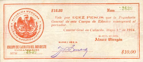 In November 1913 Alvaro Obregón ’s forces captured Culiacán, the capital of Sinaloa, thus securing the supremacy of the Constitutionalist Army throughout the entire area of Northwestern Mexico. It was in Culiacán that Obregón authorized his first issue of currency, a series of notes ($5, $10, $20[image needed] and $50), dated 23 April 1914, that the Paymaster General would repay within a fortnight of that date.