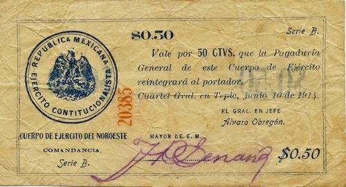These notes bear more than a passing resemblance to the ones that Riveros had already issued in San Blas and Culiacán, and one can perhaps see a desire to impose a generally accepted template. These notes and the subsequent series had the printed name of Obregón and the handwritten or stamped signature of Chief of Staff (Mayor Jefe de Estado Mayor) F. R. Serrano.