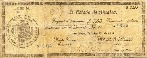 In August 1915 the Federal government’s debt to the state included $523,577.43 for paper money issued in San Blas (Por emisión Papel Moneda en San Blas)[ ] Gobernación exp. 17, August 1915.