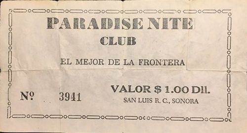One note is on light pink paper, measures 90mm x 140mm, and has the inscription PARADISE NITE / CLUB / EL MEJOR DE LA FRONTERA / No. 3941 VALOR $1.00 Dll. / SAN LUIS R. C., SONORA.