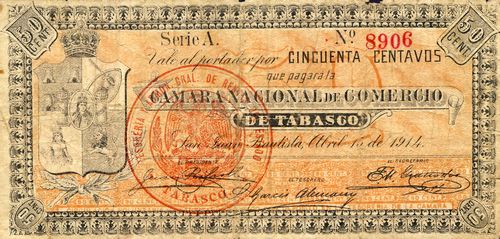 Obviously by early 1914 there was a scarcity of low values coins in Tabasco so the local Chamber of Commerce issued 20c and 50c notes dated 15 April 1914.