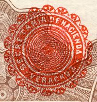 In its notification the Jefatura de Hacienda in Puebla said that the first consignment that it had received from the Tesorería de la Federación was all of the $1 denomination. For counterfeit notes the red seal on the reverse was poorly printed with bad white lettering and the ‘waves’ that surround it.