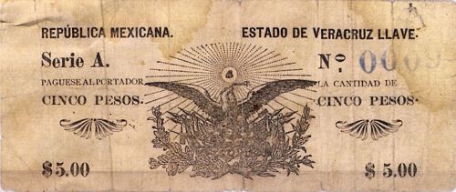 There were four denominations, all in series A. The impressions, designs, and numbers were printed in black ink although the numbers often appear blue. The signatures were also printed in black ink. The stencils were engraved in the city of Xalapa and printed in the “Le Imprime” printshop in Misantla. This printshop was owned by Professor Pedro Ramírez Olivares and was controlled by the government for the production of these notes. Later the press was dismantled and carried to the town of Juchique, for use under the printer Eduardo Viñas.