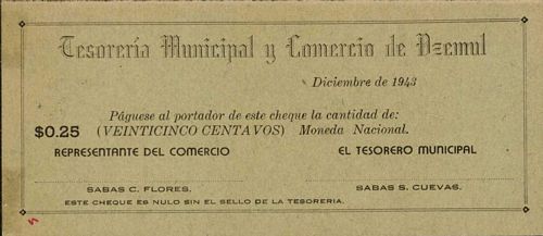 This 25c piece, with its design based on the first Mérida issue above, shows that the authorities and businesses at least contemplated issuing notes to address a shortage of small change, as late as December 1943.