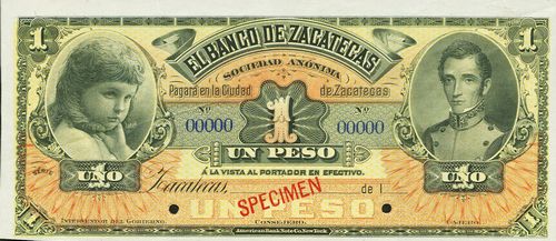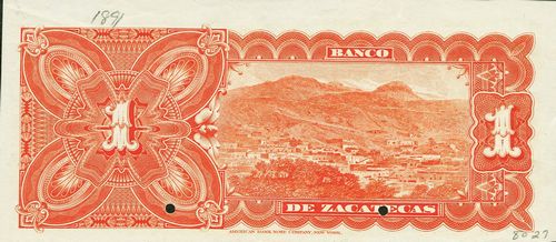 The bank issued notes in seven denominations ($1, $5, $10, $20, $50, $100 and $500) printed by the American Bank Note Company in New York. All of them bear a vignette (C 181) of Francisco García SalinasFrancisco García Salinas was born on the Hacienda of Santa Gertrudis, Zacatecas in 1786. He studied in the seminary of Guadalajara and returned to his hometown to dedicate himself to the mining industry. When the War of Independence ended, he was counselor of the Municipal Government of Zacatecas during 1821. While a Senator in 1825, he pointed out serious financial errors to the Ministry of the Treasury. Because of this, he was appointed Minister of the Treasury in the cabinet of Guadalupe Victoria. He held this post until 1828 when he was elected Governor of Zacatecas (1828-1834). In 1841, President Santa Anna offered him the post of Minister of the Treasury once again, which he refused shortly before his death. He died in San Pedro, Zacatecas in 1841. (governor from 1828 to 1834) on the face as well as different allegories and rural or industrial scenes.