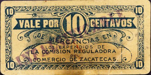 The Comisión Reguladora del Comercio in Zacatecas was established by governor Carlos Plank on 13 May 1916Periódico Oficial, Año 2, Tomo 2, Núm. 40, 13 May 1916. It was given $50,000 in operating capital by the Dirección General de Rentas and empowered to buy goods at the most favourable prices, which might have been the way its notes entered circulation.